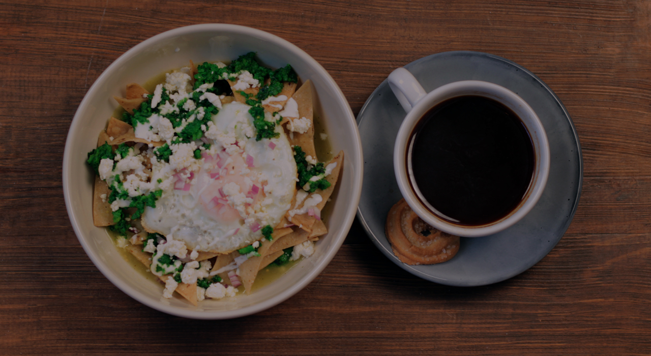 Huevos con ejote ahogados en morita, en base de frijol con hoja santa y queso Chiapas.
