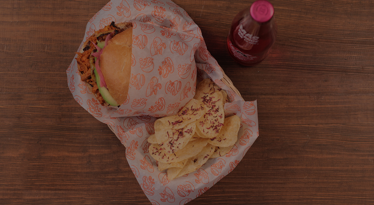 Torta de cochinita. Cochinita pibil horneada en hoja de plátano, acompañada de piña asada, cebolla morada, frijoles con hoja santa y aguacate.